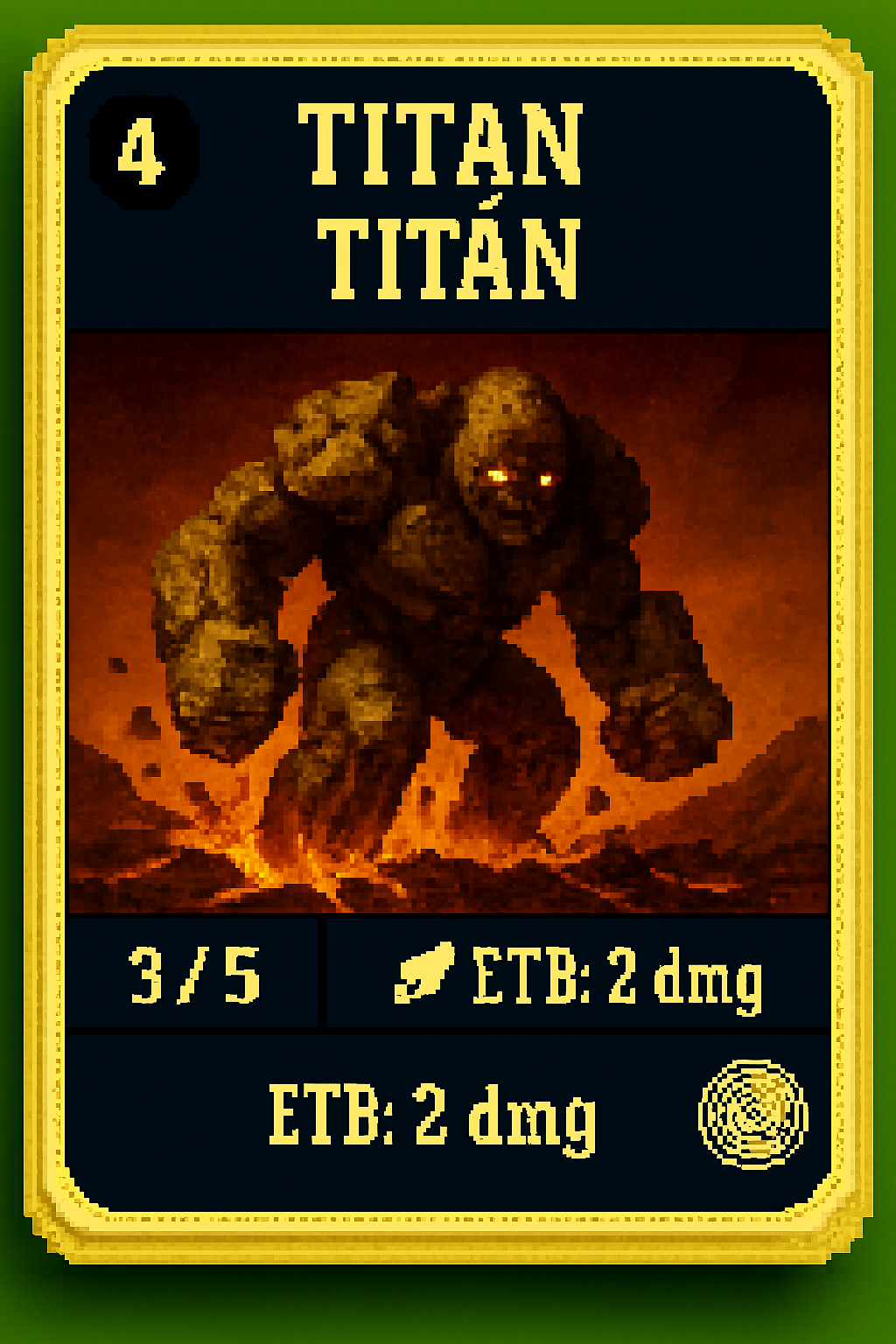 PnP listo: 1 PDF (reglas EN/ES bilingües + 40 cartas 63x88mm pixel art + tokens). Imprime, corta, ¡juega en mesa o bolsillo! Decks sample: Aggro Dmg, Control Taunt, Mid Value.